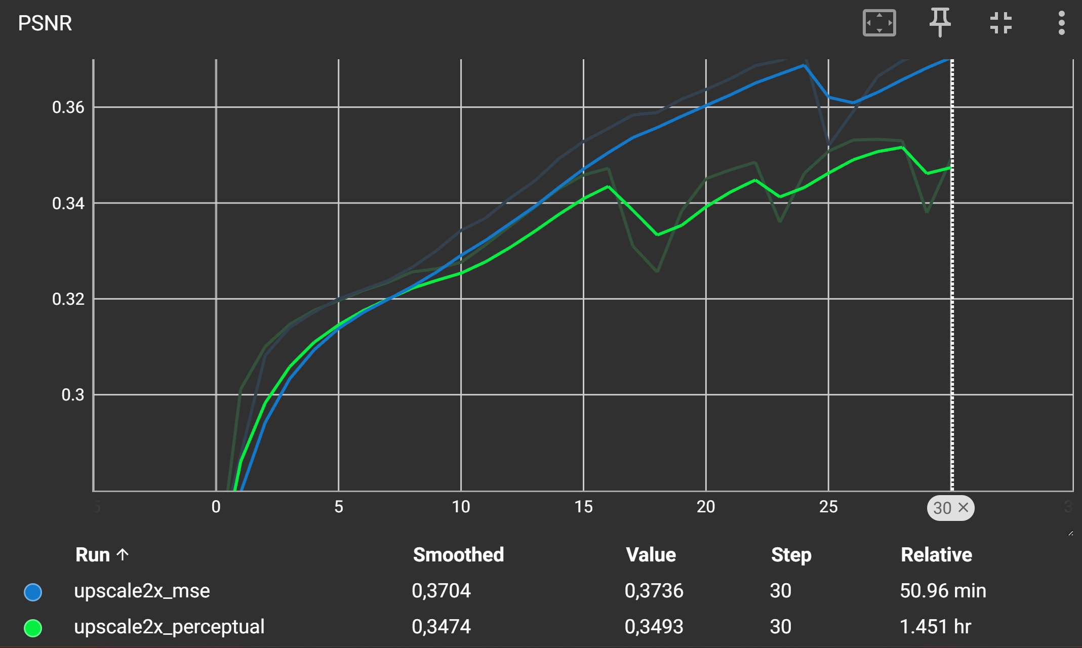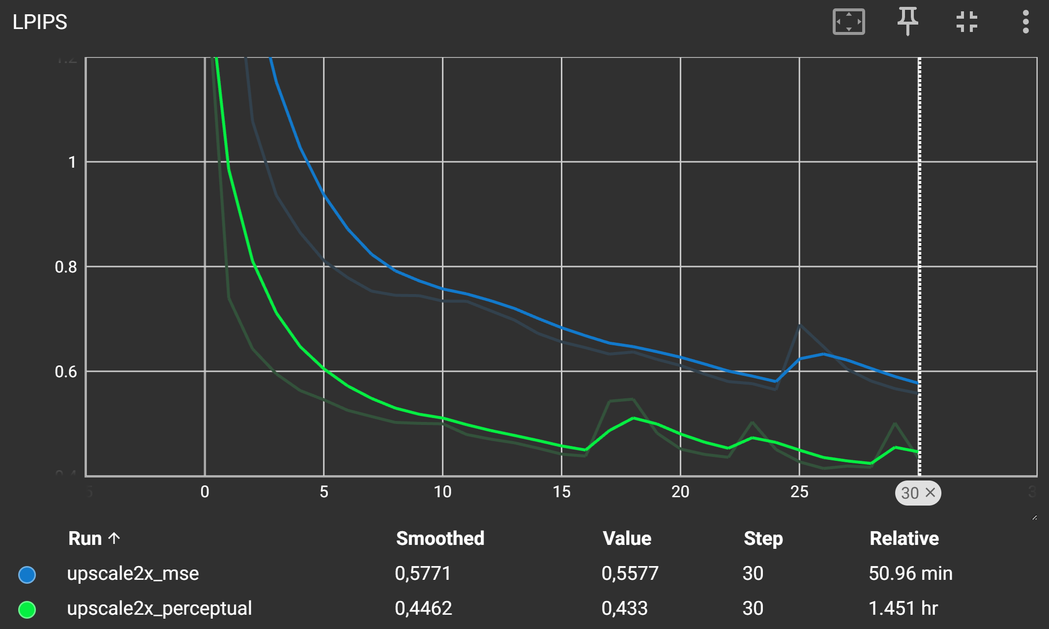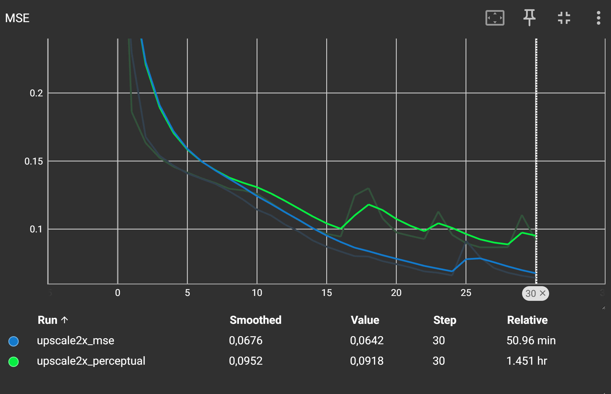 Trainieren Sie dann ihren Upscaler sowohl mit dem Perceptual Loss als auch mit dem MSE-Loss. Vergleichen Sie wieder.