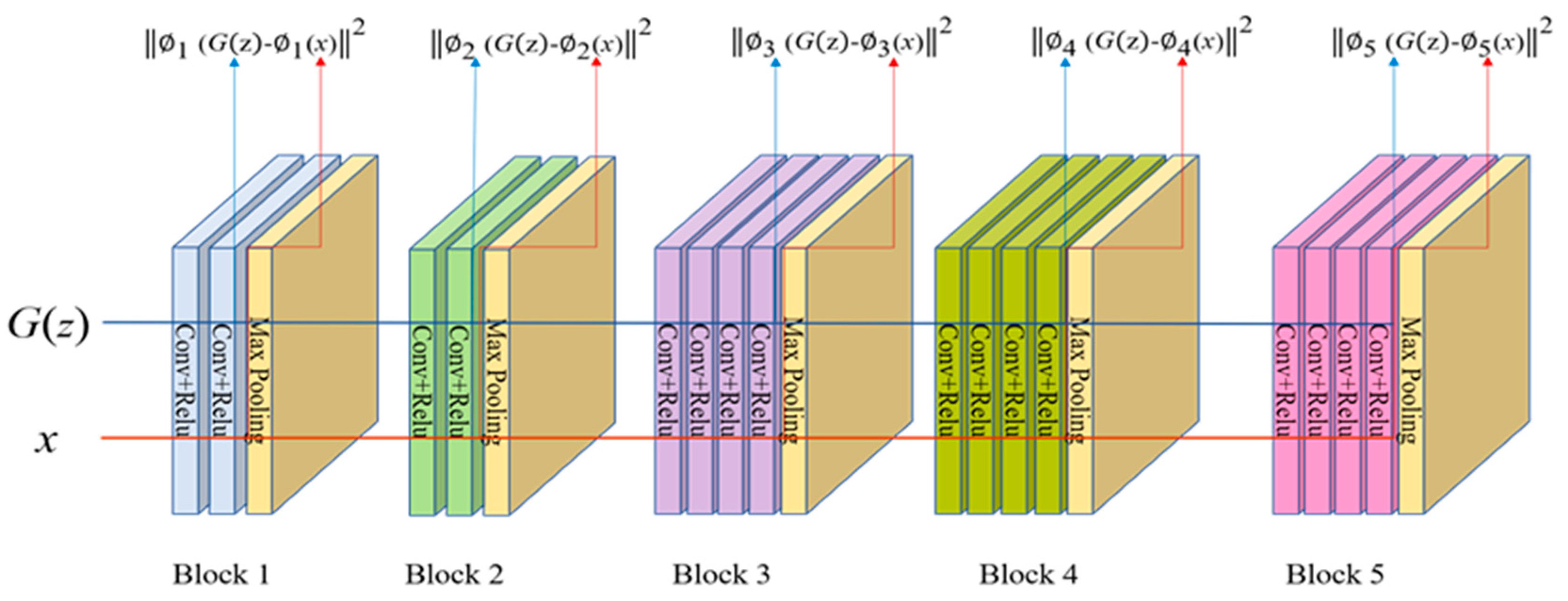 Die obige Abbildung zeigt den Prozess der Berechnung des Perceptual Loss. Die beiden zu vergleichenden Bilder (\(x\) und \(G(z)\) für Ground Truth und Output) werden durch das VGG16-Netzwerk geleitet. Die Aktivierungen aus den Convolutional-Layern werden extrahiert und der L1-Abstand zwischen den entsprechenden Feature-Maps wird berechnet.