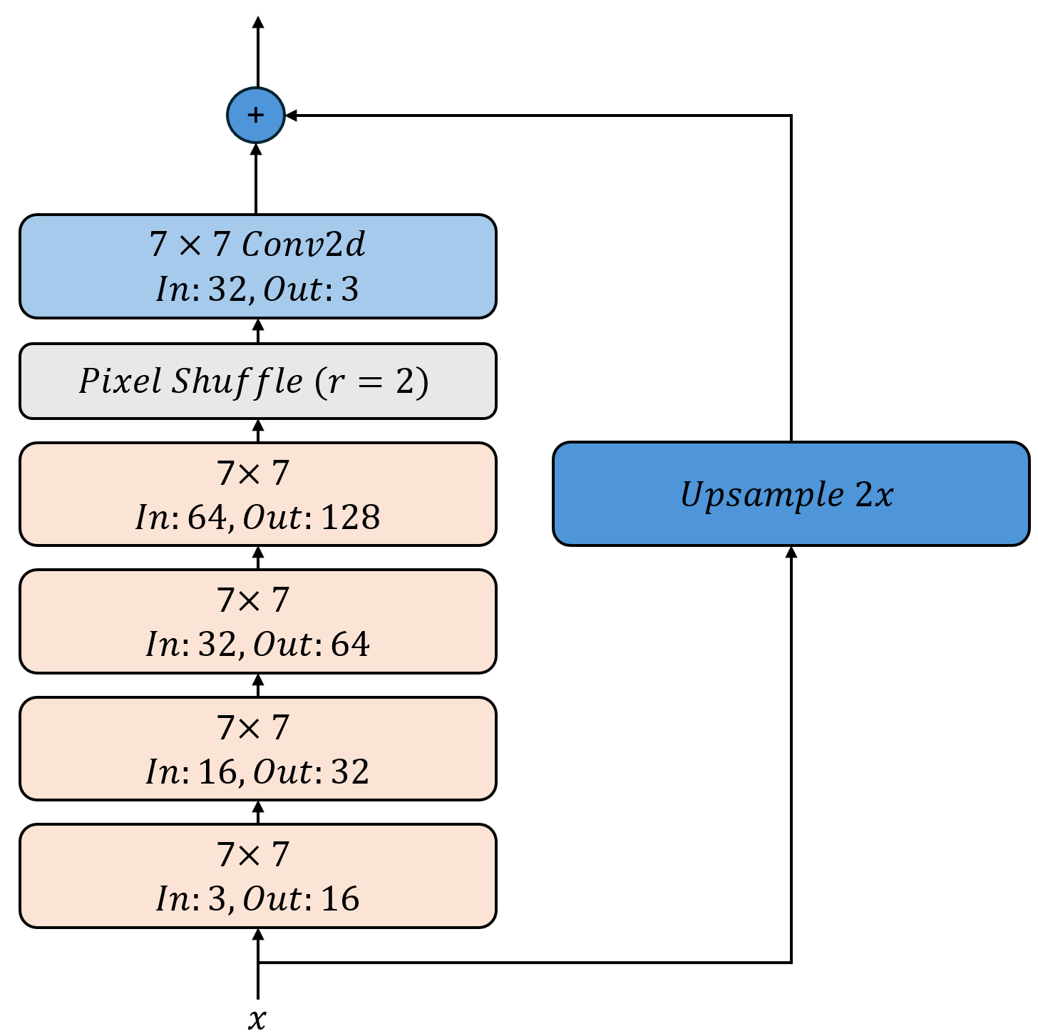 Wir verwenden vier aufeinanderfolgende ResNet-Blöcke mit zunächst 3 auf 16, dann 16 auf 32, dann 32 auf 64 und schließlich 64 auf 128 Kanäle. Anschließend verwenden wir ein PixelShuffle-Layer mit einem Upscale-Faktor von 2, um die räumliche Auflösung des Bildes zu verdoppeln. Dabei wird die Zahl der Kanäle auf 32 reduziert. Zum Schluß verwenden wir eine klassische Faltung mit einer weiteren 7x7 Maske, welche die 32 Kanäle auf 3 reduziert.