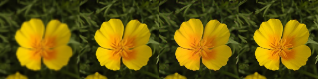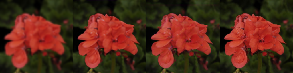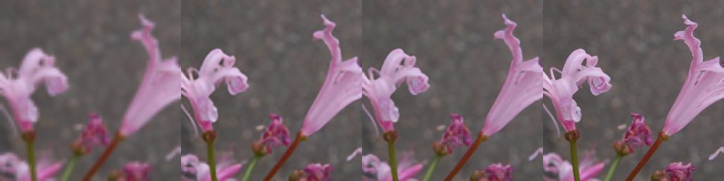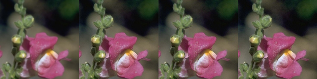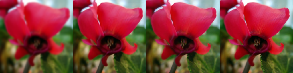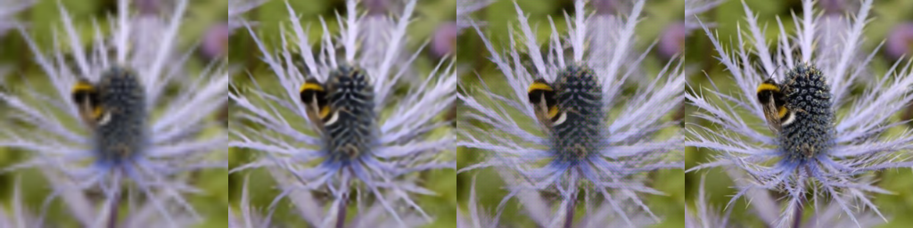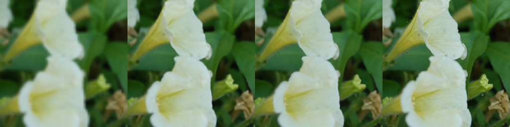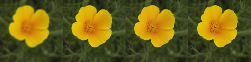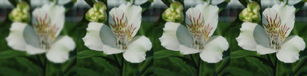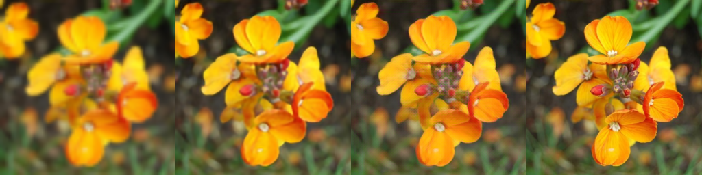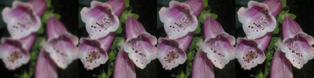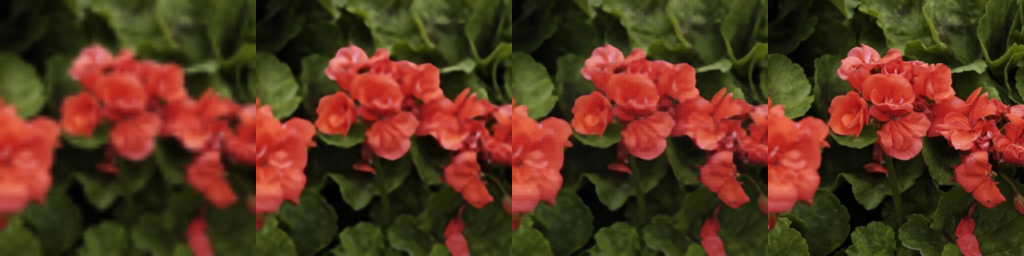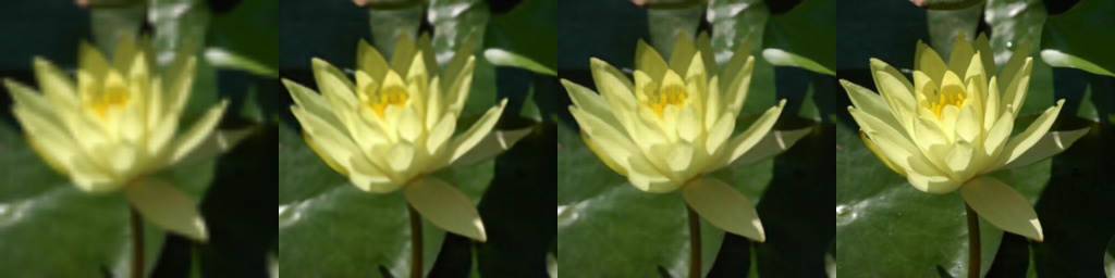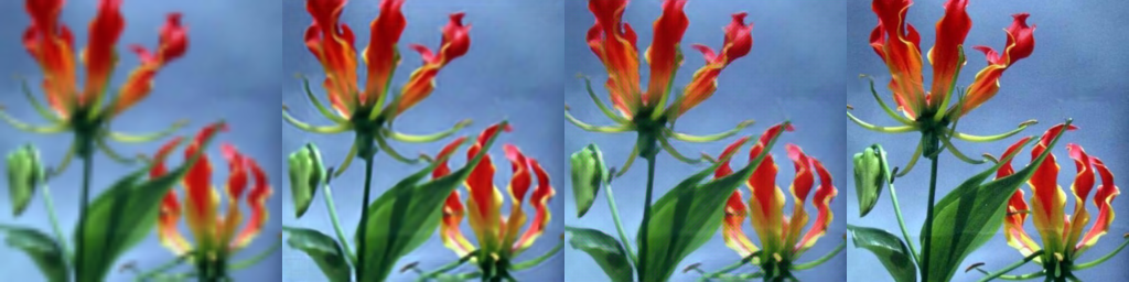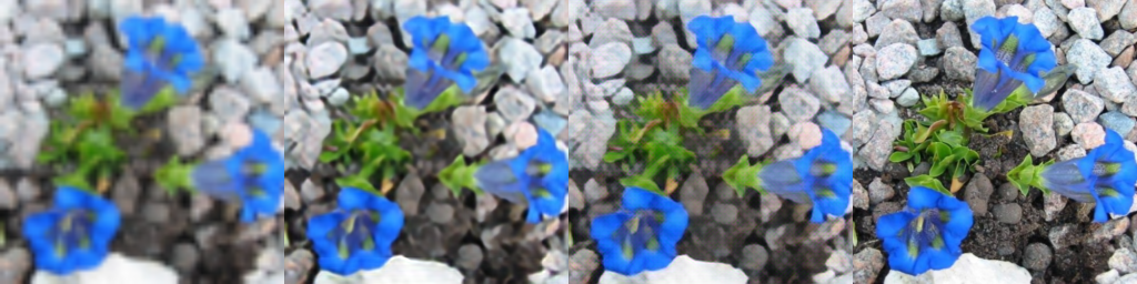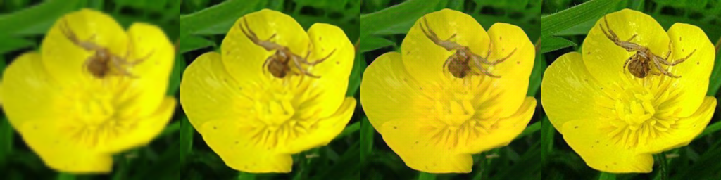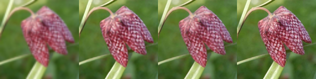 In den unten stehenden Bildern sehen Sie die Ergebnisse des Trainings. Das ganze linke Bild zeigt das (hochskalierte) Eingabebild in niedriger Auflösung. Daneben finden Sie die Ausgabe des Upscalers, welcher mit MSE-Loss trainiert wurde gefolgt von der Ausgabe des Upscalers, welcher mit Perceptual Loss trainiert wurde. Ganz rechts sehen Sie das Ground Truth Bild in hoher Auflösung.