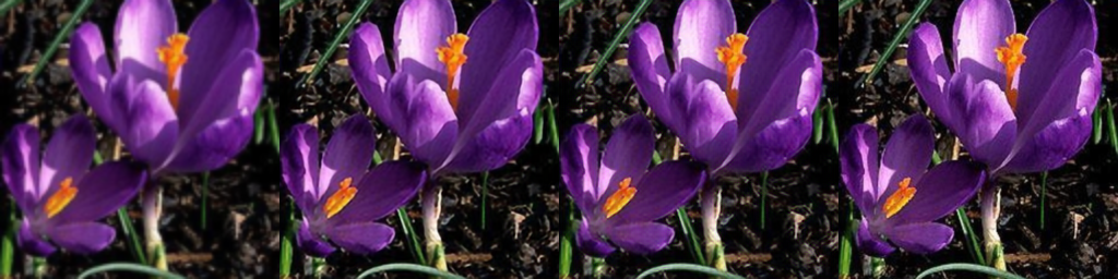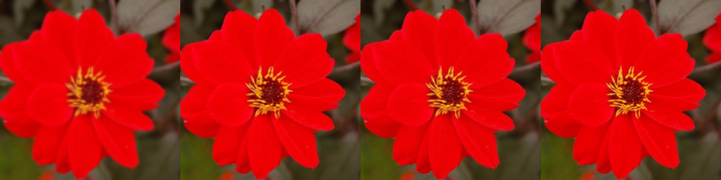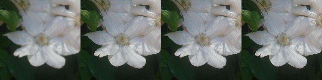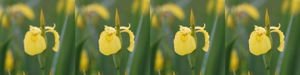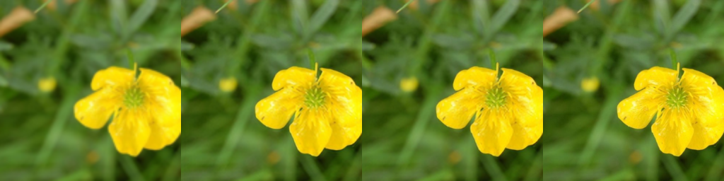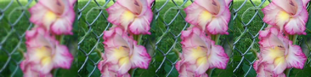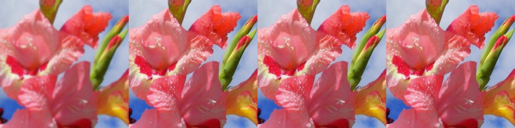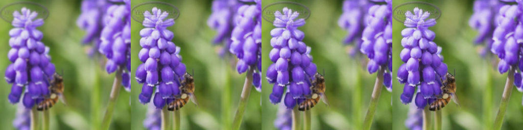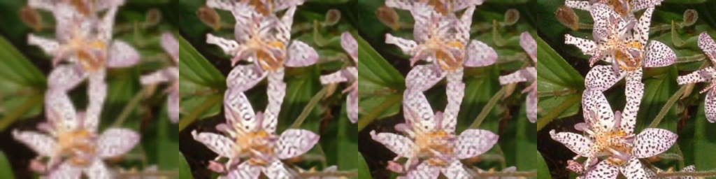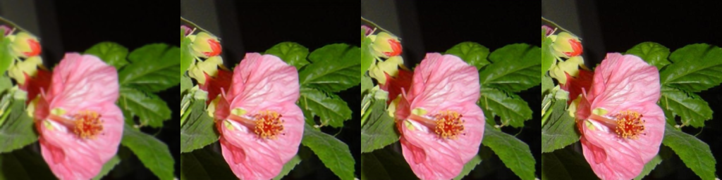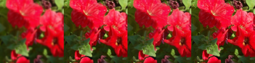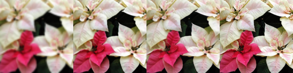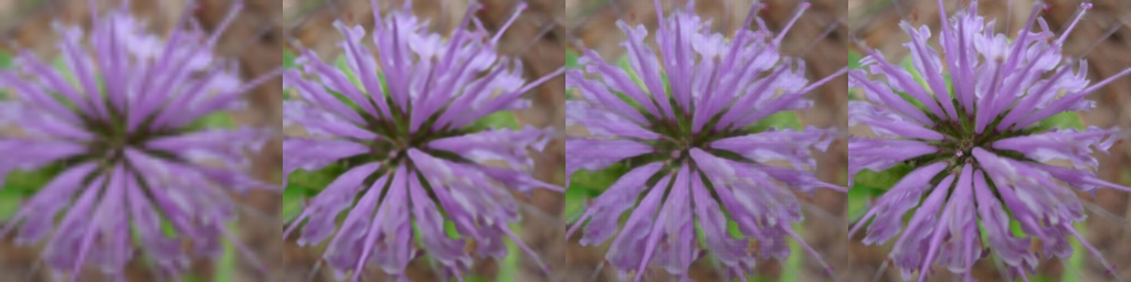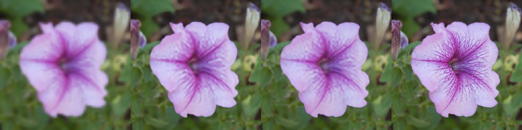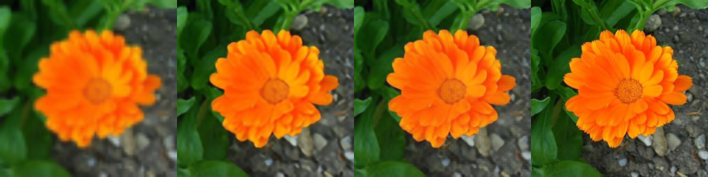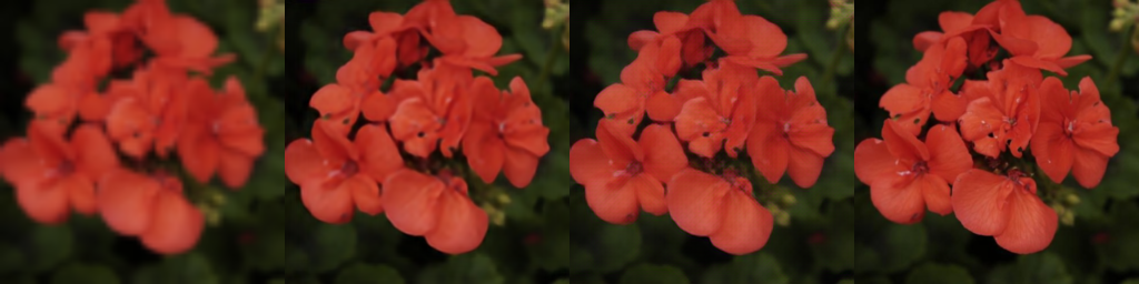 In den unten stehenden Bildern sehen Sie die Ergebnisse des Trainings. Das ganze linke Bild zeigt das (hochskalierte) Eingabebild in niedriger Auflösung. Daneben finden Sie die Ausgabe des Upscalers, welcher mit MSE-Loss trainiert wurde gefolgt von der Ausgabe des Upscalers, welcher mit Perceptual Loss trainiert wurde. Ganz rechts sehen Sie das Ground Truth Bild in hoher Auflösung.