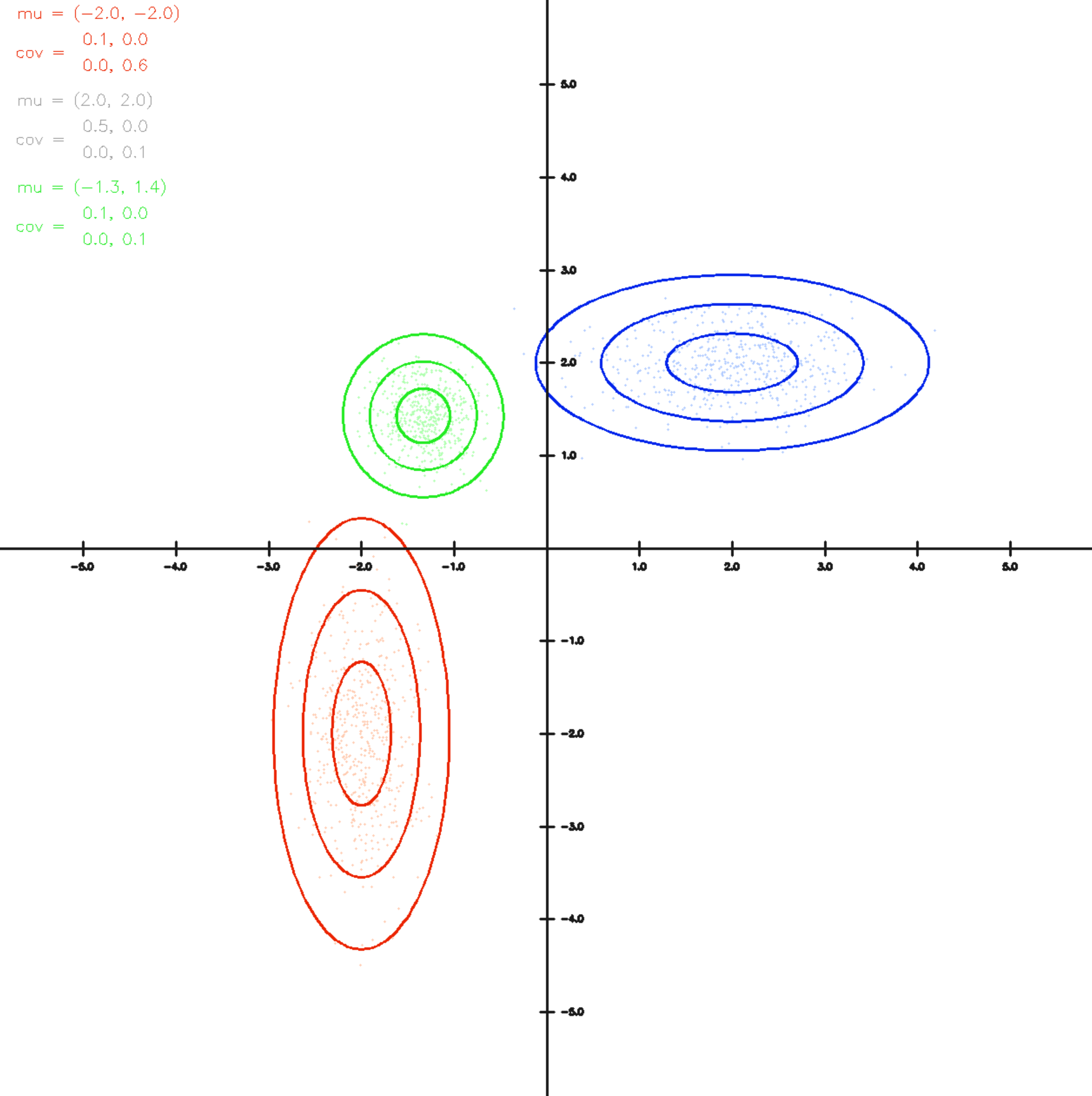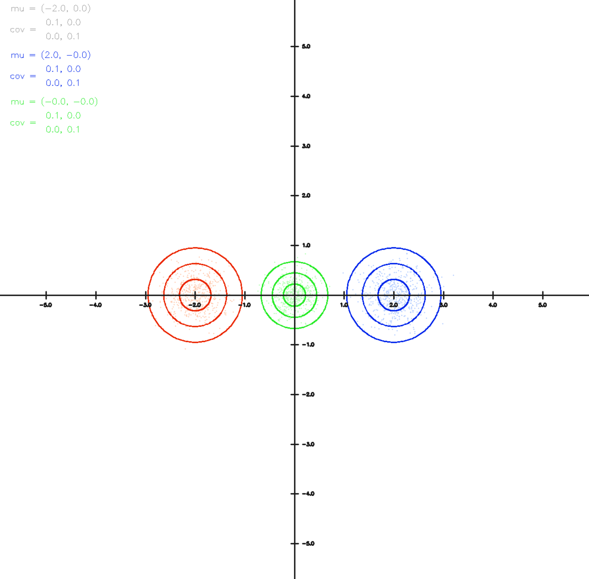 Starten Sie dann das Program und experimentieren Sie mit verschiedenen Konfiguration. Sie können die rote Ellipse durch drücken von „1“ steuern während Sie die blaue Ellipse durch drücken von „2“ kontrollieren können. Mit den Tasten „wasd“ (Kleinbuchstaben) verschieben Sie die Ellipsen während Sie mit „WASD“ (Großbuchstaben) die Horizontale bzw. Vertikale Varianz vergrößern bzw. verkleinern können. Mit „Q“ und „E“ (Großbuchstaben) erhöhen bzw. verringern Sie die Korrelation zwischen horizontaler und vertikaler Messung, die Ellipse „dreht“ sich entsprechend ein.