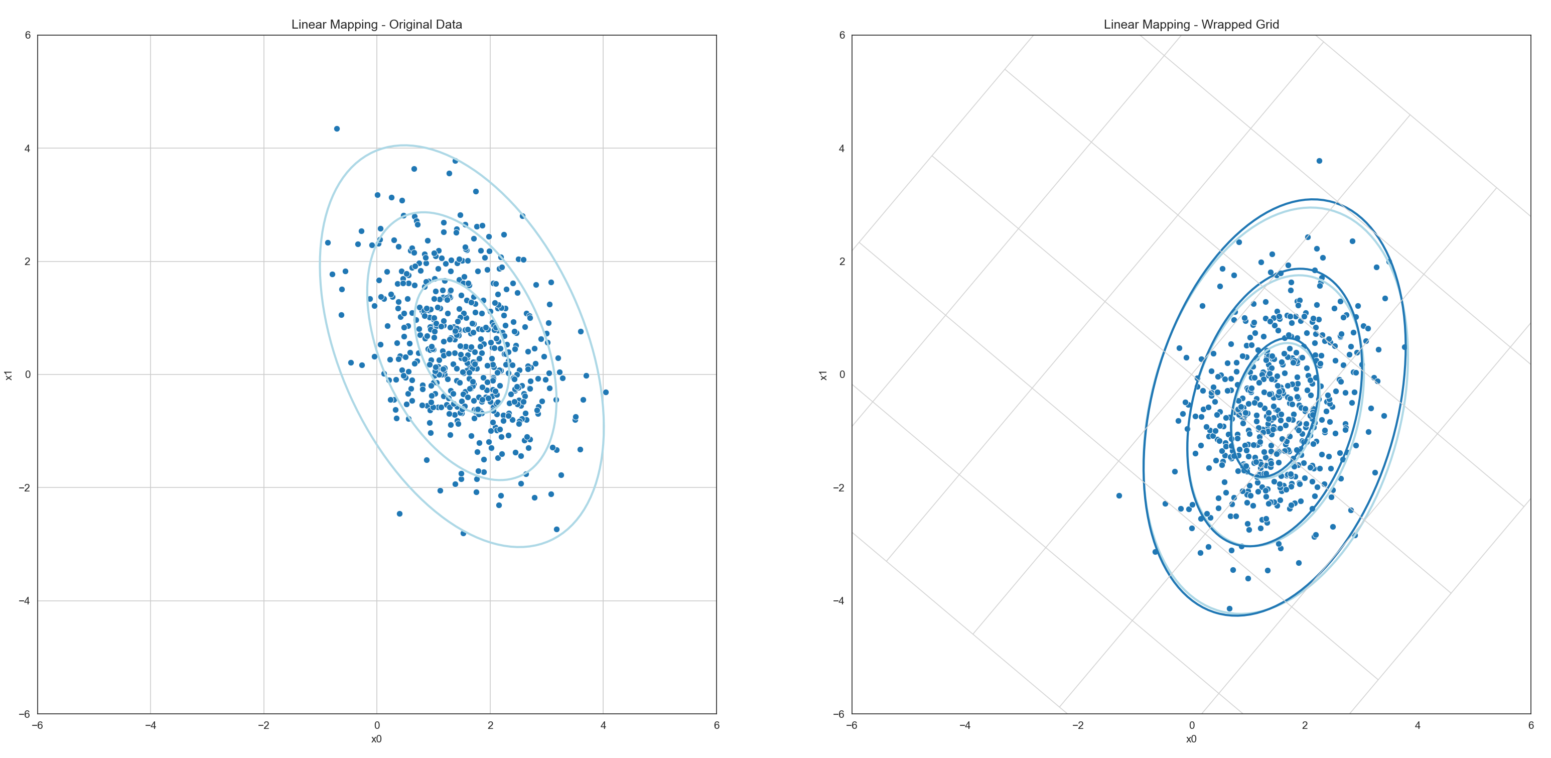 Die Samples wurden individuell mit der linearen Abbildungsmatrix in das neue Koordinatensystem überführt und anschließend wieder der sich ergebende Mittelwert sowie die Kovarianz der Punktwolke bestimmt. Die so entstehende Punkte sowie Ellipsen wurden hellblau in das rechte Koordinatensystem eingezeichnet.