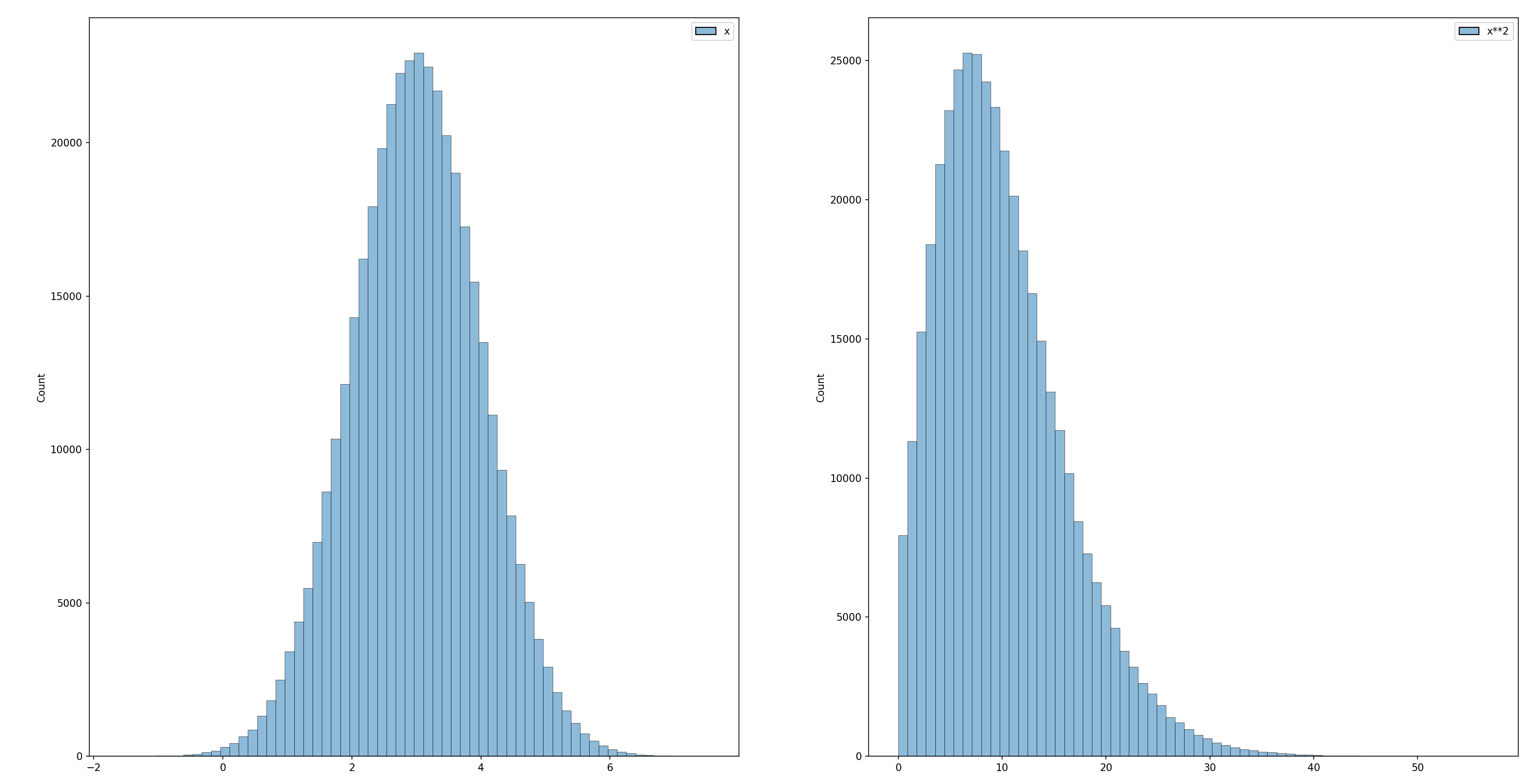 Die Abbildung zeigt ein einfaches Beispiel. Links ist das Histogram von 400.000 Samples einer normalverteilten Zufallsvariable mit Mittelwert \(\mu=3\) und Varianz \(\sigma^2 = 1\) gezeigt. Wird die Zufallsvariable durch \(f(x) = x^2\) auf eine neue Zufallsvariable \(\boldsymbol{Y} = f(\boldsymbol{X})\) abgebildet, so ist diese offensichtlich nicht mehr normalverteilt (siehe dazu das rechte Histogram der sich ergebenden Verteilung).