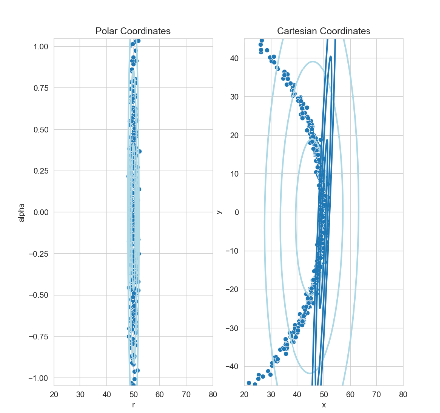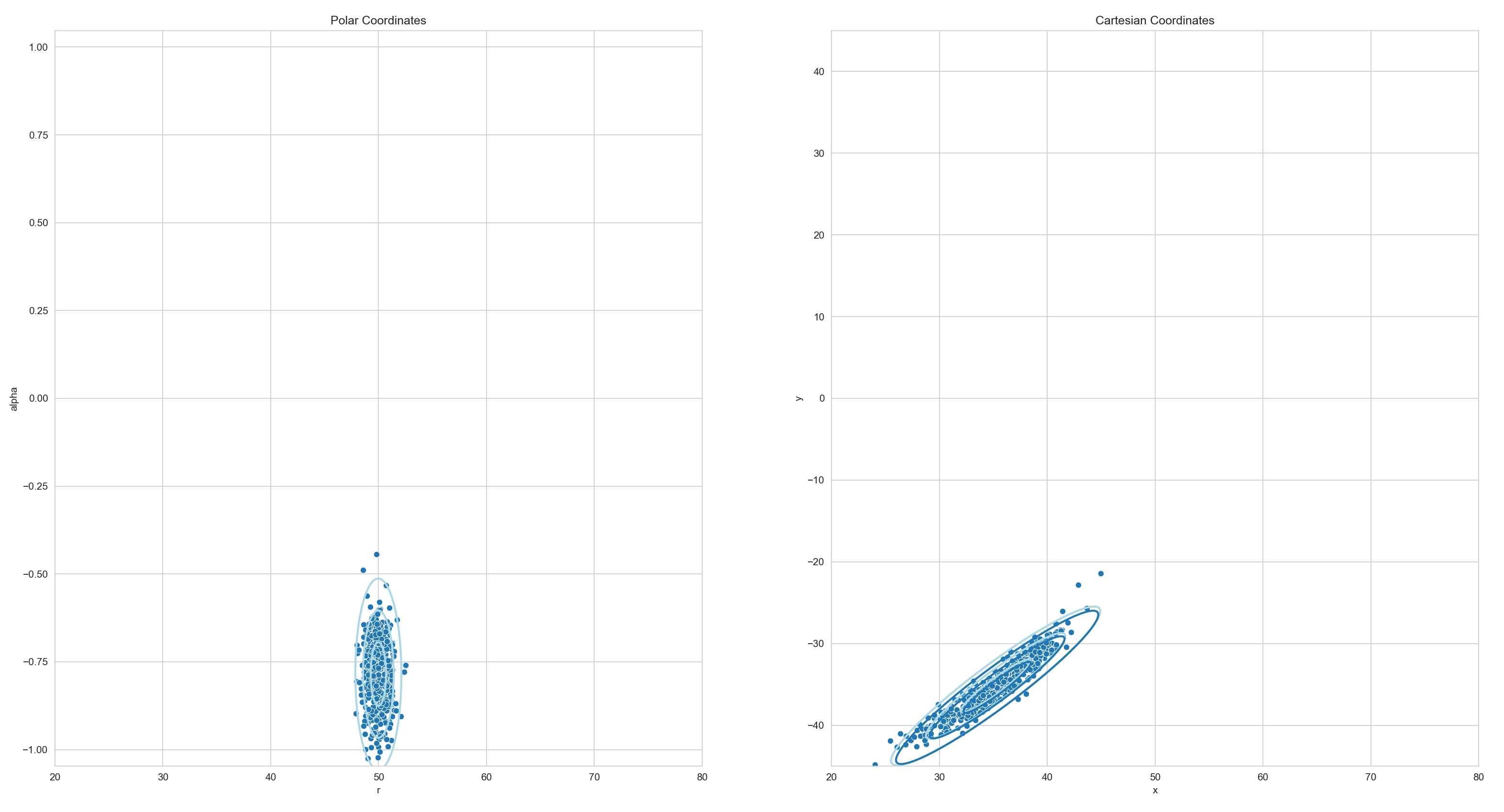 Der obige Plot zeigt ein Beispiel für eine solche Transformation. Links ist die normalverteilte Zufallsvariable \(\boldsymbol{X}\) zu sehen. Die Zufallsvariable weißt in \(r\)-Richtung (horizontal) nur eine geringe Unsicherheit auf. Das entspricht einer hohen Genauigkeit was Entfernungsschätzungen angeht. In \(\alpha\)-Richtung (vertikal) ist die Unsicherheit deutlich größer, die Winkelgenauigkeit ist also deutlich schlechter. Das entspricht dem typischen Unsicherheitsprofil eines Radars.